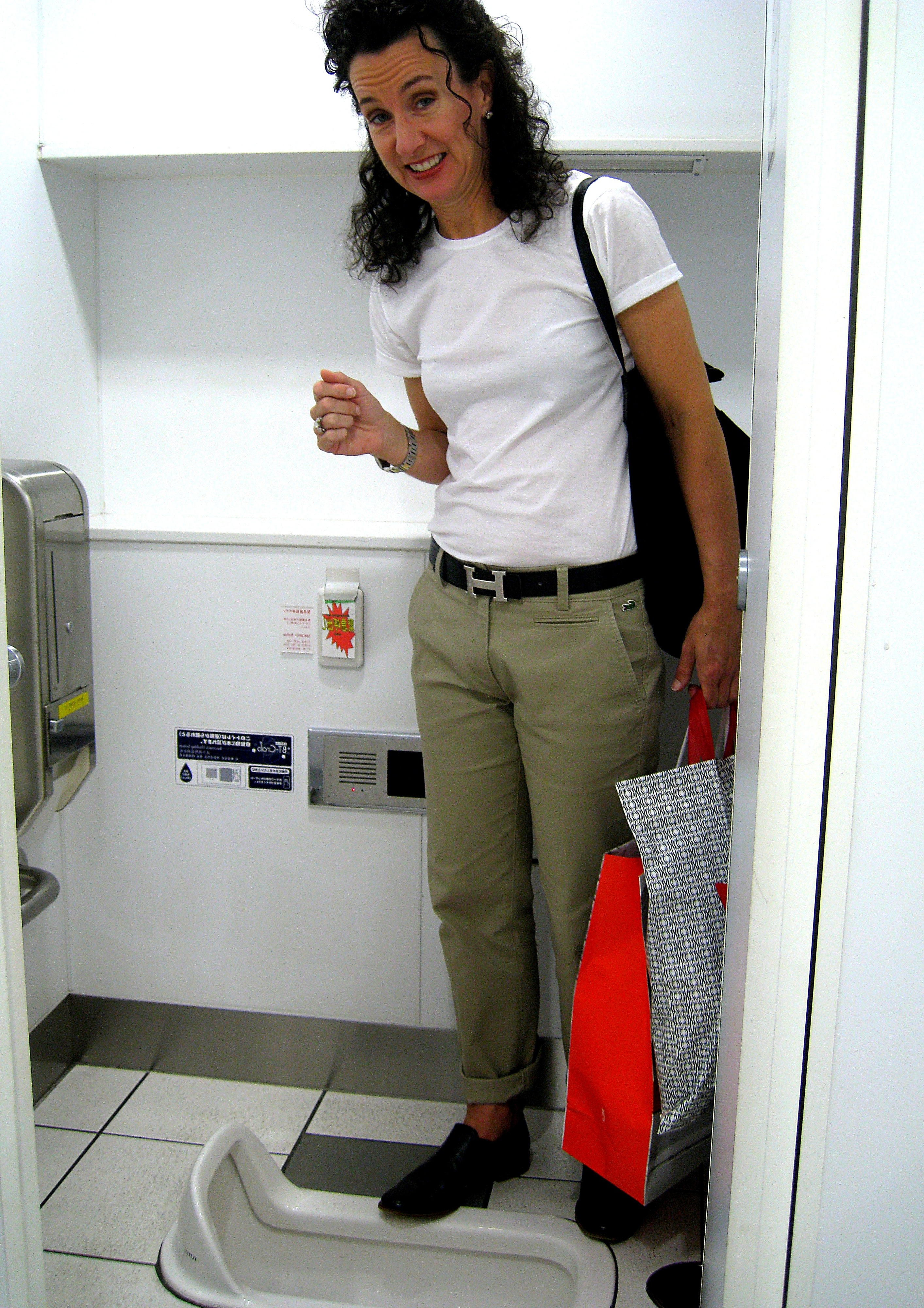 img: Emily Cannell deciding whether to put her carrier bags down and use the facilities in Tokyo’s Harajuku station.