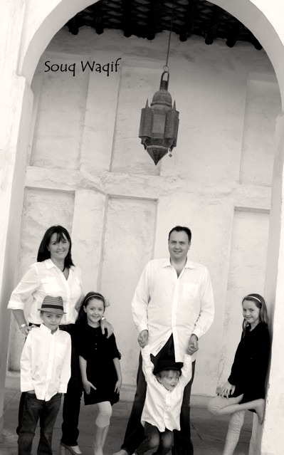 img: Kirsty Rice with her family (sans the beagle) at Souq Waqif, Doha, Qatar.
