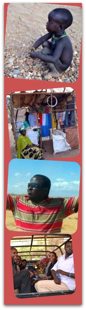 Images (top to bottom): A child in Lengima helping to collect stones for the building of the village school; a BOMA business in the village of Ngurunit; Kura Omar, BOMA’s man in Northern Kenya; a “taxi” full of BOMA Village Mentors, at the end of the three-day Mentor University training program.