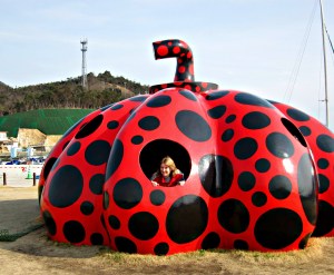 img: Suzanne Kamata standing inside a pumpkin sculpture on the Japanese island of Naoshima (March 2011). The sculpture was created by the well-known artist Yayoi Kusama, who was herself an expat for awhile. (She lived in New York City in the 1960s.)