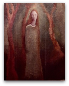 Here I painted myself looking like a phantom standing in a dark and gloomy woods, which symbolized the closed-in feelings I had about transience, loneliness, and instability. The ghost is passing through the landscape of an imaginary world because “place” did not yet exist.