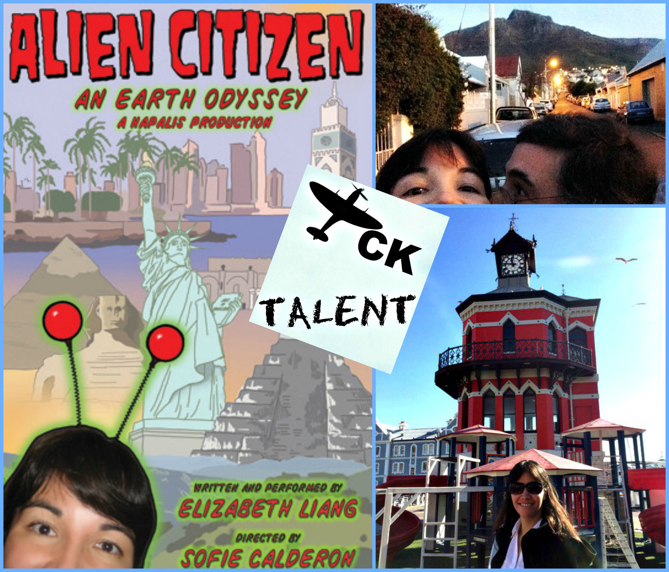 Having delivered a successful show, TCK Talent columnist Lisa and her husband (and techie), Dan, explore Cape Town. Photo credits: (from left) Alien Citizen poster; Lisa and Dan on the street where they rented a cottage in Woodstock; Lisa in front of the clock tower on the V&A Waterfront. (All photos supplied, taken by either Lisa or her husband, Daniel Lawrence.)