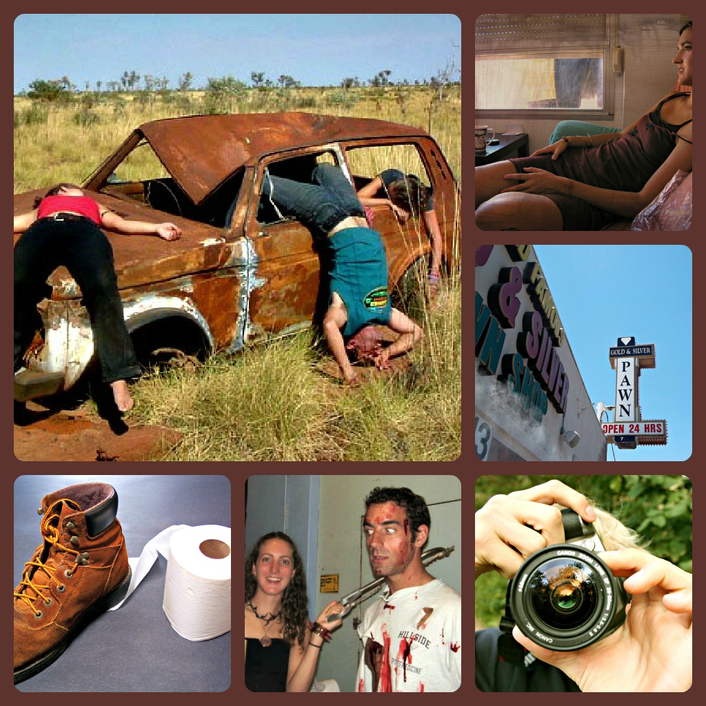 Images (clockwise, left to right): Horror image from Tony’s personal collection: fooling around with an abandoned vehicle near Wolfe Creek, Northern Territory (2007); sexy woman, pawn shop and Canon camera all from MorgueFile; Tony’s “undead” photo from a Halloween in Perth, Australia (2008); toilet paper and travel boot from MorgueFile.