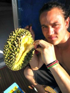 img: Mark Wiens in the act of trying, for the first time, to cut open a durian fruit, on his balcony in Bangkok.